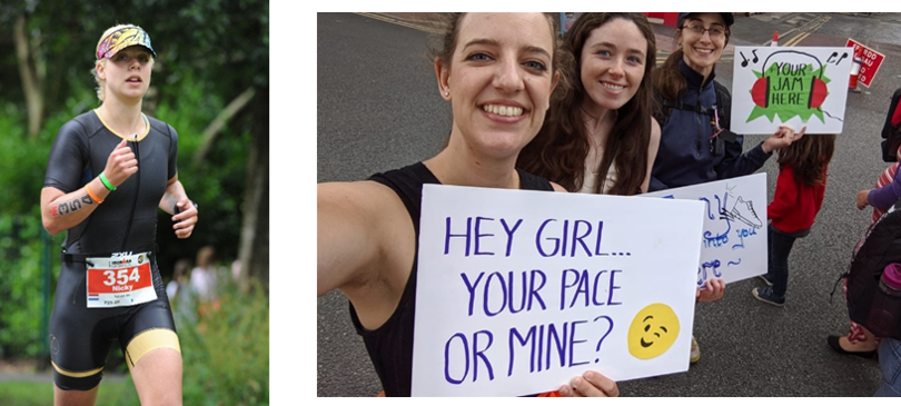 As I ran onto the course, I felt good, and more importantly, my legs felt good. I was overjoyed and super surprised. This was my fourth moment of confidence: maybe this IM might turn into a very good one. This was immediately followed by my fifth moment of confidence, when I saw my sister, Stef and Emma. They had a big sign which said: “Nicky, you’re now chasing No. 7!”. And I was so excited to see them and very happy that I was positioned in the top 10 in my age group. I kept running and felt like I was flying, and I had to consciously tell myself to slow down and keep it easy. I was running at sub 4 hour marathon pace, even though my target was 4.5-5 hours, since the marathon was 400 meters of climbing and after a long day out.