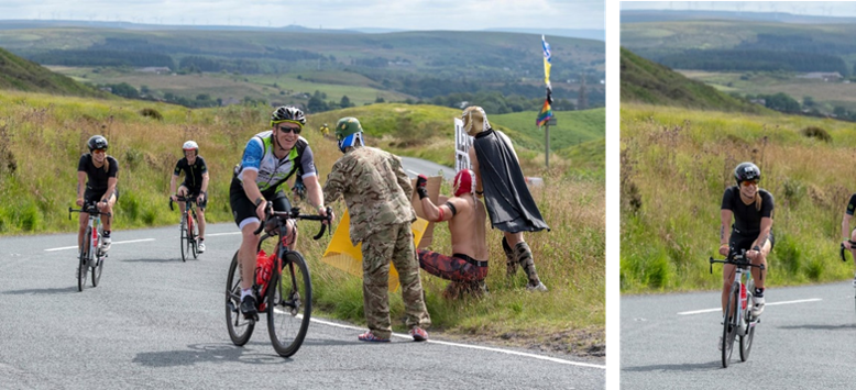 The second highlight was hitting the top of Sheephouse lane, where I met the famous “Sheephouse Lane Wrestlers”, which were men dressed up as super heroes. They were dancing to super loud music, and had the most incredible signs (“you are my favourite”, “Kapow”, “don’t stop when you’re tired, stop when you’re done”) and were welcoming each cyclist as if we were superheroes ourselves and shouted encouraging words and gave high fives. You could see and hear them from afar and it made the climbing even more enjoyable.